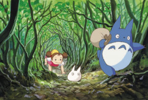 Und natürlich darf sich auch Totoro endlich großformatig schütteln, die Titelfigur von Mein Nachbar Totoro, das Wappentier von Studio Ghibli, das auf der ganzen Welt verehrte und geliebte Freiheitswuschelwesen der Phantasie. Menschen eher nüchternen Naturells sehen in Totoro eine kindliche Kompensationsphantasie, die zwei kleinen Mädchen durch eine schwierige Zeit der Umbrüche hilft. Jenen mit etwas mehr Einbildungskraft allerdings wird ein großer Baum danach nie wieder wie einfach nur ein großer Baum erscheinen. Er könnte auch die Wohnstätte eines wundersamen Riesenpelzviechs sein, das des Nachts auf den Ästen sitzt und Flöte spielt.