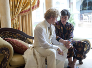 Sehr viel hübscher anzuschauen war heute Morgen der wohl auf längere Zeit wirklich letzte Film von Stephen Soderbergh, Behind the Candelabra, über das geheime Privatleben von Liberace. Der Film schwelgt im Pomp des schrillen Entertainers, der sich nicht ganz zu Unrecht wie ein Wiedergänger des bayerischen Märchenkönigs Ludwig II. fühlte. Die Einrichtung seines Palastes in Las Vegas, die Phantasiekostüme aus Glitter und Pelz, der Goldschmuck, die Siebziger-Fönfrisuren – alles so kitschig und durchgeknallt, dass man auch in den zäheren Momenten des Films immer genug Schauwert hat, um sich bestens zu amüsieren. Michael Douglas ist seiner ersten Rolle nach der Krebserkrankung verkörpert Liberace mit einer fast beängstigenden, hinreißenden Ähnlichkeit. Liberace, der Zeit seines Lebens jeden verklagte, der ihn homosexuell nannte, wird hier aus der Sicht seines langjährigen Liebhabers, Ziehsohns und Assistenten Scott Thorson geschildert, der erst 16 Jahre alt war, als er den über 50 Jahre älteren Liberace kennenlernte, bei dem er bald darauf einzog. Matt Damon spielt ihn vom anfangs unschuldig-naiven Boy bis zum schönheitsoperierten, drogenabhängigen Wrack – sicher eine der besten Leistungen seiner Karriere. Der Film erzählt die Phase von 1977 bis zu Liberaces AIDS-Tod 1987 und schafft es in zwei Stunden, nicht nur eine Ära auferstehen zu lassen, die wie eine andere Welt wirkt, sondern auch aus einer öffentlichen Witzfigur einen dreidimensionalen Charakter herauszuschälen. Produziert wurde der Film für den Bezahlsender HBO, wo er bereits am kommenden Sonntag ausgestrahlt wird. Alle Studios hatten zuvor abgewunken, trotz Starbesetzung. Manche Dinge haben sich eben immer noch nicht geändert.