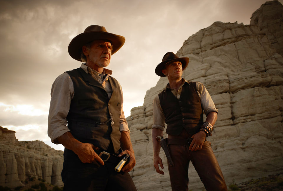 Sheriff Taggart hat den missratenen Sohn des mächtigen Ranchers Dolarhyde (Harrison Ford) verhaftet, der mal wieder für Unfrieden in dem kleinen Städtchen Absolution gesorgt hatte. Danach hat er gleich noch einen Fremden ohne Namen und ohne Gedächtnis inhaftiert, der eben erst eingeritten war und sich als „Most Wanted Man“ Jake Lonergan (Daniel Craig) erwies. Die beiden sollen mit der Postkutsche zur nächstgelegenen Gerichtsbarkeit verbracht werden, als Rancher Dolarhyde sich einfindet und auf der sofortigen Herausgabe seines Sprösslings besteht, sonst … Man steckt also gerade tief mitten drin in einer Rio-Bravo-Situation, als sich am Himmel von der Ferne her Lichter nähern und gleich darauf ein schreckliches, nie gesehenes Chaos ausbricht: Unbekannte Flugobjekte fischen wahllos Mitglieder der Gemeinde vom fest geglaubten Erdboden, alles rennet, rettet, flüchtet. Und sammelt sich alsbald zur Gegenwehr.