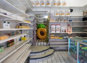 In Münster, wo man für gewöhnlich die einzelnen Stationen mit dem Fahrrad abfährt, ist der Besucher mittels Booklet bestens informiert, was einen in welcher Spieldauer erwartet. Mika Rottenberg hat passend zu ihrer Filminstallation Cosmic Generator (ca. 20 Minuten) einen aufgelassenen Asia-Laden als Location gewählt. Der Film spielt überwiegend in und unter der Grenzstadt Mexicali/Calexico, die durch einen Zaun getrennt ist. Im mexikanischen Teil wartet man im Golden Dragon Restaurant auf Gäste für die surrealen Speisenarrangements, im kalifornischen Teil ist der Schauplatz ein 99 Cent-Store. Soweit so normal, wäre da nicht die Parallelwelt eines Tunnelsystems, das die beiden unterschiedlichen Orte unterirdisch verbindet. Es herrscht eine lähmende Trägheit in diesen Stores, prall gefüllt mit glitzernd-blinkend-buntem Plastiktand. Mitarbeiterinnen starren in Bildschirme, vollführen gelangweilt absurde Tätigkeiten oder sind überhaupt über ihrer Arbeit eingeschlafen. Dennoch scheinen der unterirdische Handel und der Kontakt nach Oben bestens zu funktionieren. Selten ist ein aktuelles politisches Statement so heiter gewesen.