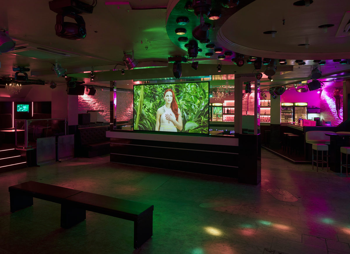 In Münsters Innenstadt, die wie anderswo in Deutschland im Bemühen, ein historisches Stadtbild auferstehen zu lassen, wieder aufgebaut wurde, findet man sich hinter der Fassade dann doch wieder in der Moderne und gelangt durch eine Passage in die Elephant Lounge. Die in die Jahre gekommene Diskothek aus dem Jahre 1974 ist Ambiente wie Setting für Bye, Bye Deutschland! Eine Lebensmelodie (20 Minuten) von Benjamin de Burca und Bárbara Wagner. Nach eingehender Beschäftigung mit der Brega-Szene in ihrer brasilianischen Heimat widmen sich die beiden Künstler für Münster dem deutschen Schlager und dessen aktiver Fangemeinde vor Ort. Im Zentrum ihres dokumentarischen Musicals stehen zwei stadtbekannte Größen, auch sie finden sich im Laufe des Films als Gäste in der schummrigen Elephant Lounge wieder. Mehr Ortsspezifik geht nicht.