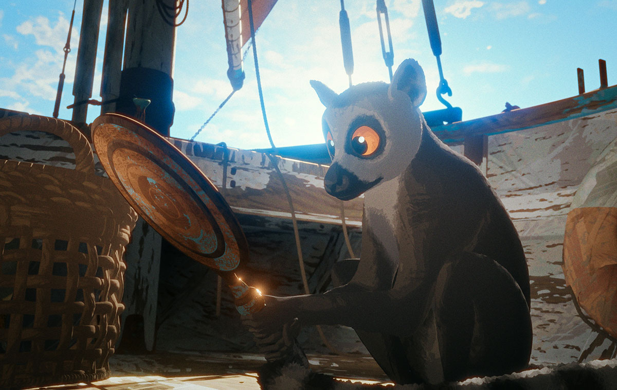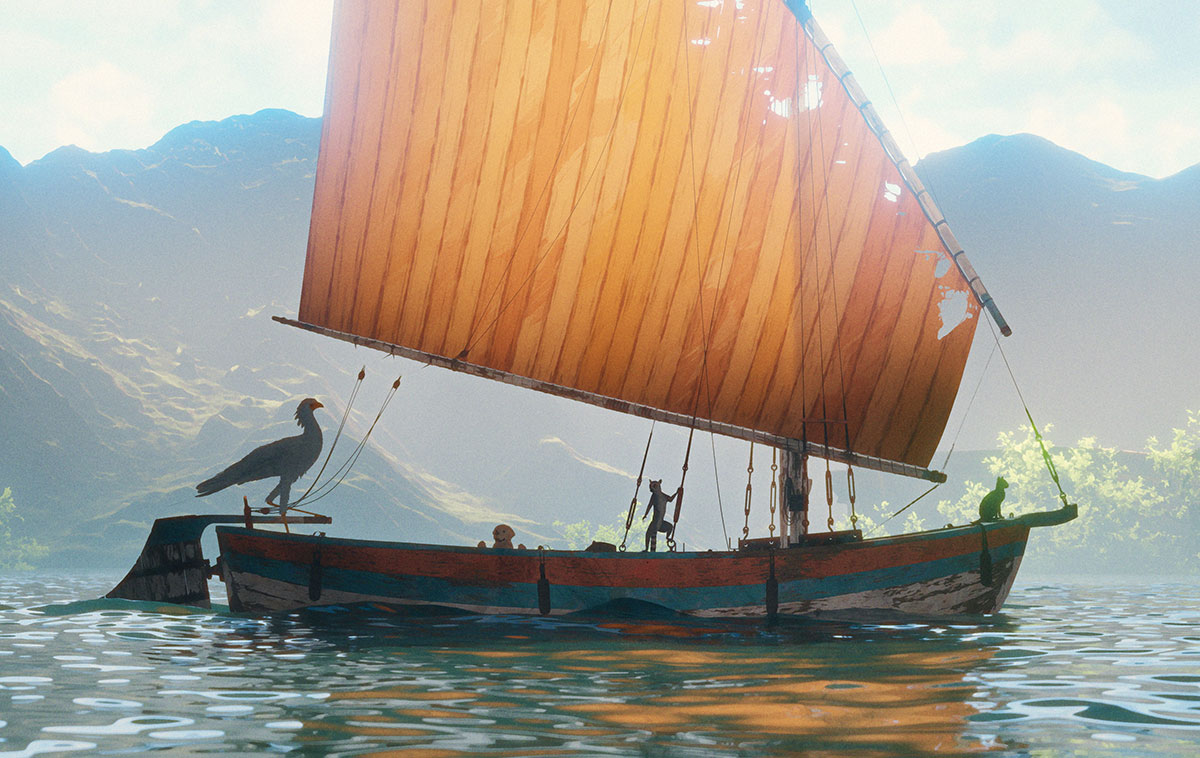 Eben schien die Welt noch in Ordnung. Doch dann flüchten in einer panischen Stampede die Tiere des Waldes vor stetig steigendem Wasser. Eine veritable Sintflut überschwemmt die Erde. Das Kätzchen kann sich gerade noch auf ein Boot retten: eine Dau, an deren Steuer ein schweigsames Wasserschwein steht. Bald kommt ein Hund dazu, dann ein Lemurenäffchen, schließlich schließt sich ein Sekretärsvogel an. Es ist ein zusammengewürfelter Haufen, unterwegs in einer vom Untergang verzauberten, farbenfrohen Welt. Der gesellige Hund stiftet Unfug, das Lemurenäffchen ist in sich selbst vertieft, der Sekretärsvogel hält Ausschau, während stoisch am Steuer das Schwein steht und das Kätzchen alle misstrauisch beobachtet. Mit der Zeit aber und im Bestehen von mancherlei Abenteuer wird aus der Notgemeinschaft eine Gruppe von Gefährten, die sich umeinander und füreinander sorgt.