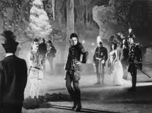 Und trotzdem. Bleiben wir bei Syberbergs Opus Magnum, Hitler – ein Film aus Deutschland (1977). In diesem letzten Teil der Trilogie hält Heinz Schubert als Zirkusdirektor eine Rede. In weißer Livree, mit weißem Zylinder spricht er direkt in die Kamera: „Alle, die nun noch einmal Stalingrad sehen wollen oder den 20. Juli oder den einsamen Wolf im Bunker seines Niedergangs (…), müssen wir enttäuschen. Wir zeigen nicht die nicht wiederholbare Realität. Auch nicht die Gefühle der Opfer mit ihren Geschichten. Auch nicht die Geschichten der Sachbuchautoren und die großen Geschäfte mit Moral und Horror. Mit Angst und Tod und Buße und Arroganz und direktem Zorn.“ Während er spricht, sind hinter ihm Bilder einer jubelnden Menge als Rückprojektion zu sehen. „Was wäre Hitler ohne uns?“, fährt Schubert in seiner Grundsatzrede fort. Ungläubig lässt man die Szene noch einmal laufen. Da spricht einer 1977 über Filme, die es noch gar nicht gab: Joseph Vilsmaiers Stalingrad von 1993, das 20. Juli-Drama Valkyrie, das 2009 unter der Regie von Bryan Singer fertig gestellt wird, und Der Untergang, in dem der berüchtigte Bernd Eichinger 2004 vom Ende des Führers als einsamem Wolf erzählt. Der gleiche Bernd Eichinger übrigens, der Syberbergs Hitler-Film 1977 produzierte. Und plötzlich ist Schluss mit veraltet. In Karl May (1974) besetzt Syberberg Helmut Käutner, einen Proponenten der vorausgegangen Regiegeneration (Grosse Freiheit Nr. 7), in der Titelrolle. In Ludwig – Requiem für einen jungfräulichen König (1972) lässt er Fassbinder-Regular Harry Baer im Hermelin-Cape als bayerischen Kini auftreten. Zwei weitere Monomanen, gefangen in der eigenen Ikonografie. Baer gibt zu Wagner-Arien den sterbenden Schwan, birgt den Kopf im Pelz und haucht: „Ich war einmal“ oder „Ich, der Schattenkönig, will es so.“ In der Rückprojektion laufen diesmal Videobilder von Touristenmassen, die durch Ludwigs Neuschwanstein trotten. Syberberg zeigt die Inszenierung von Macht als unendliches Spiegelkabinett, in dem sich Herrscher und Berherrschte gleichermaßen verlieren. Für Alltag ist in dieser endlosen Fiktion kein Platz, die spärlichen Tageslichtaufnahmen unterlegt Syberberg mit Farb- und Sepiafiltern.