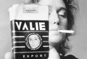 Das war 1967, ich habe mich zu der Zeit mit meiner Identität auseinander gesetzt. Identität ist – wenn auch nicht nur – durch den Namen gegeben. Ich hatte zuerst den Namen meines Vaters, danach den Namen meines geschiedenen Mannes. Ich wollte aber einen eigenen Namen haben, den ich mir selbst aussuche, und den ich auch als künstlerisches Konzept verwenden kann. Valie war sozusagen mein Nickname. Und auf EXPORT bin ich gekommen, weil ich auf der Suche war nach einem Namen, der ein Markenzeichen sein könnte oder der etwas Umfassenderes bezeichnet. Ich habe EXPORT gewählt, weil ich meine Ideen, Gedanken exportieren wollte, und weil es auch gut zu merken ist. Nachdem klar war für mich, dass EXPORT mein Künstlername ist, habe ich nach einem Objekt gesucht, das meinen Künstlernamen deutlich visualisiert. So bin ich auf die Packung der Zigarettenmarke Smart Export gekommen, die haben damals viele geraucht. Da habe ich mir gedacht, das ist einfach das Naheliegendste. So viele Massenartikel standen nicht zur Auswahl, die ich hätte benutzen wollen. Das Bild mit der Erdkugel auf der Packung habe ich mit meinem Gesicht überdeckt – das Bild der Erdkugel ist noch immer darunter – und um dieses runde Bild herum steht „semper et ubique, immer und überall“, und „Made in Austria“ steht ebenfalls auf der Packung, was ja auch stimmt, nicht?