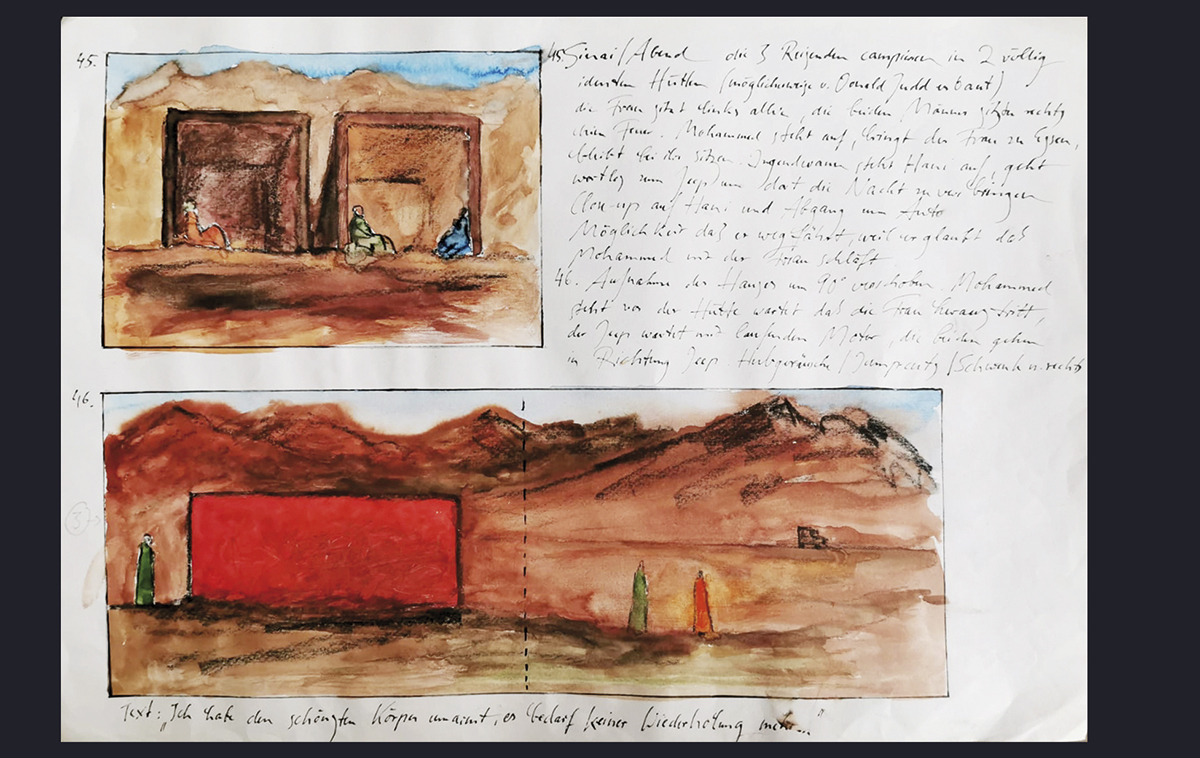 während unseres aufenthalts in kairo lernte ich einen ägyptischen guide kennen, der mich spontan auf eine wüstentour einlud. in der wüste zu sinai las ich bachmanns worte, erkannte, dass alles in ihrem buch auf besondere weise so da war. da wusste ich, meine kollegin hatte recht gehabt. dieser text wurde die grundlage meines ersten films, ich begann ebendort und sofort mit dem zeichnen von storyboards für dieses erstlingswerk mit dem titel ÄGYPTISCHE FINSTERNIS.
