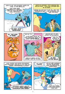 Die erste Story in der immerhin schon 11. CB-Ausgabe nennt sich „Captain Berlin gegen Captain Bootleg“ (Text: Levin Kurio, Jörg Buttgereit) und liefert, was der Titel verspricht: Der Captain – im zivilen Leben der Reporter Fritz Neumann, der Jörg Buttgereit verdächtig ähnlich sieht – muss sich mit einem Doppelgänger herumschlagen. Dabei werden auf satirische Art Fragen nach Original, Fälschung, Kommerz und Lizenzverträgen angeschnitten; Meta-Elemente finden sich ebenso wie Anspielungen auf Kampfsportfilme. Wer etwa vorher noch nicht wusste, was sich hinter dem Label „Bruceploitation“ verbirgt, lernt gleich noch was dazu – prodesse et delectare at its best. Was den visuellen Aspekt betrifft, ist ersichtlich, dass Comic-Künstler Jurek Malottke viel Spaß mit greller Farbgestaltung und übersteigerter Figurenzeichnung hatte.