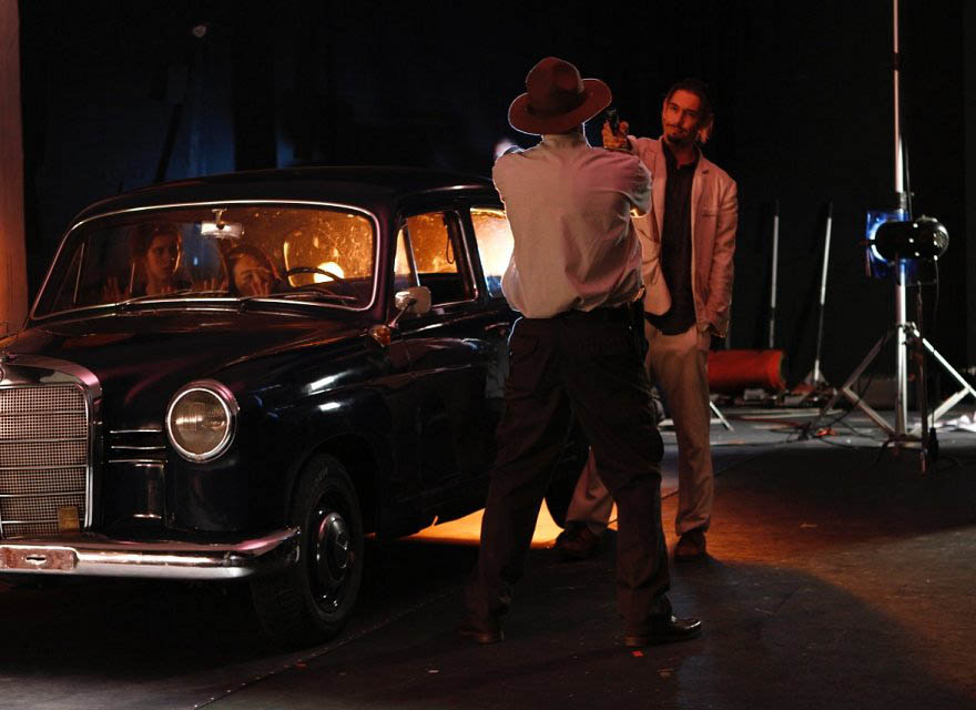 Menschen aus 39 verschiedenen Nationen waren an der Produktion von Los Feliz beteiligt. Allein die budgetären, sprachlichen und logistischen Herausforderungen müssen enorm gewesen sein. Honetschläger hat in seinem Leben als Künstler wie als Filmemacher schon viel Erstaunliches gemacht, in der Verbindung von beidem ist es in diesem Ausmaß bislang womöglich das radikalste Werk. Kardinäle, eine Gottheit, eine Museumswärterin und der Teufel. Das Casting mag noch so perfekt sein, doch  der heimliche Star des Films ist deutsch und blau und musste als echte Diva von Drehort zu Drehort geschippert werden: „Bertha“, Honetschlägers eigener Mercedes Benz aus den fünfziger Jahren. Auch so eine Ikone des Westens.