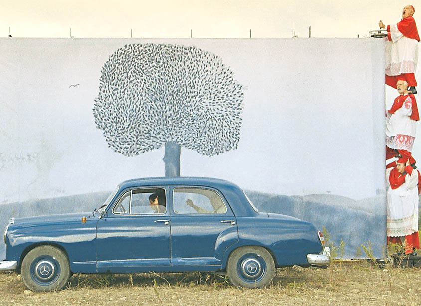 Der Klerus muss sich ganz buchstäblich zur (Wolken-) Decke strecken, damit die Dinge in ihrem Sinn am Laufen bleiben. Da stehen sie nun, die drei Kardinäle in rot-weißem Ornat, übereinandergestapelt in freier Wildbahn, der Oberste hat Mühe, eine Kurbel in Bewegung zu setzen, die anderen ächzen unter der Last auf ihren Schultern. Angetrieben wird durch das katholische Terzett eine Apparatur, die eine bemalte Leinwand vorbeiziehen lässt. Dies geschieht in Leserichtung, von links nach rechts und passend zu dem Pkw, der vor der eigens konstruierten Maschinerie platziert ist. Mit der richtigen Kameraeinstellung wird nun der Eindruck erweckt, das Auto sei in Bewegung in Richtung Westen. Und eben Westen ist das Ziel eines anderen, nicht ganz so einheitlichen Dreigespanns innerhalb des Autos. Kaya, die japanische Shinto-Göttin, möchte die Liebe verstehen lernen, Lydia, die französische Museumswärterin, zieht es des Ruhmes wegen in die Ferne, und auf der Rückbank hat ein nicht ganz so einnehmender britischer Geselle – der Teufel – Platz genommen. Angeheuert von den drei Kardinälen, soll er sich gegen den Bedeutungsverlust der Bildkultur der westlichen Welt einsetzen.