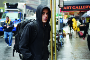 Was einen von Anfang an in Mr. Robot hineinzuziehen vermag, sind der fantastische Hauptdarsteller (Rami Malek als nerdiger Hoodie mit oft unnachahmlich selbstversunkenen, tränensackschweren Augen), die kinotaugliche Regie (Pilotregisseur: Niels Arden Oplev) und das komplexe Drehbuch eines Neulings im Fach des filmischen Erzählens – mit dem unkonventionellen Liebesdrama Comet (2014) hat Sam Esmail erst einen abendfüllenden Kinofilm als Autor und Regisseur zu Buche stehen. Wie Rami Malek ist Esmail, 38 Jahre alt, US-Bürger ägyptischer Herkunft. Zur Zeit der Dotcom-Blase gründete er ein Internet-Start-up, seine früheren Arbeitskollegen sind Programmierer, darunter auch ein paar Hacker. Was diesen Menschen immer missfallen hat, war die unzureichende Darstellung medientechnologischer Vorgänge in Kino und Fernsehen. In Mr. Robot finden sich nun z.B. Open-Source-Betriebssysteme wie Linux ebenso adäquat abgebildet wie an frühe MS-Dos-Zeiten erinnernde Weiß-auf-Schwarz-Programmierschnittstellen.