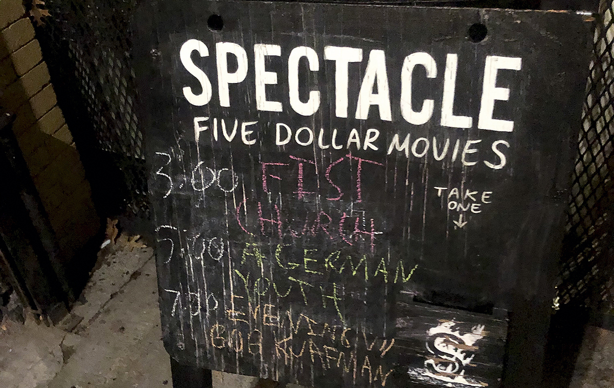 Das seit Herbst 2010 geöffnete Spectacle ist ein Vorführraum in Williamsburg, der ausschließlich von Freiwilligen betrieben wird. Mit dem täglichen Programm, das sich „übersehenen und selten gezeigten Werken, ausgefallenen Juwelen, zeitgenössischer Kunst und radikaler Polemik“ widmet, ist es zu einem Kleinod in der Nachbarschaft geworden. Von außen sieht es aus wie ein abgefuckter, ausgestorbener Laden, dessen Schaufenster mit alten Plakaten verklebt sind, aber der erste Eindruck täuscht. Hier steckt Leben drin und man kann sich Filmperlen für nur fünf Dollar ansehen. Als einzigartiges