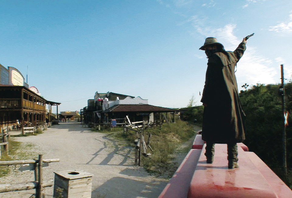 2. Der Themenpark ist eine Welt der Illusion an sich und definiert sich durch seine Grenze, zumal er als historische Kulisse eingerichtet ist. Gegen Ende des Films lässt Florian Flicker die Menschen, mit denen er zuvor vier Wochen lang in der niederösterreichischen Westernstadt gelebt hat und deren Teil er geworden ist (der Regisseur taucht immer wieder selbst im Bild auf), in einem Heißluftballon ihre kleine Welt von oben betrachten. Als Zuschauer bekommen wir diese zu Recht nicht zu sehen, denn die Illusion wäre durch den Anblick jedweder Form eines Außen zerstört.