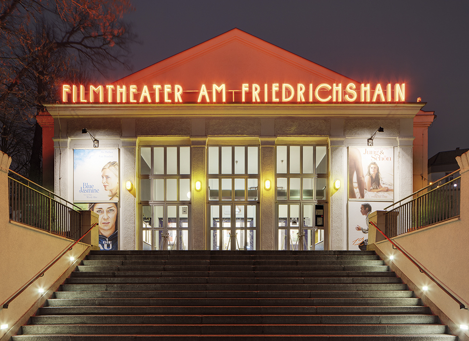 Das prunkvolle Lichtspielhaus im Stadtteil Prenzlauer Berg wurde 1925 unter dem Namen „Olympia“ mit beeindruckenden 1.200 Sitzplätzen in Betrieb genommen. Seither wird das Filmtheater durchgehend bespielt. Von außen besticht das Haus durch eine klassizistische Fassade und eine imposante Freitreppe. 1994 rettete eine Gruppe rund um Regisseur Michael Verhoeven das Kino vor dem Abriss. Gemeinsam mit der Yorck-Gruppe machten sie aus dem Filmtheater am Friedrichshain einen Arthouse-Spielort mit hervorragender technischer Ausstattung, fünf originell gestalteten Sälen und einem vielseitigen Programm quer durch verschiedene Genres. Am beliebtesten ist der Saal 2, der mit einem wallenden goldenen Gipsvorhang und den leuchtenden blauen Glasquadraten in der gelben Wandbespannung das Publikum immer wieder aufs Neue begeistert. Auch die Berlinale ist alljährlich im Februar im Filmtheater am Friedrichshain zu Gast.