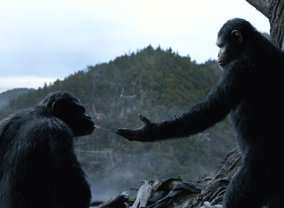 Nachdem der erste Konflikt zwischen Affen und Menschen am Ende von Rise of the Planet of the Apes (Planet der Affen: Prevolution) reichlich gewaltsam ausgetragen wurde, zogen sich die Affen unter Führung ihres durch Genmanipulation besonders intelligent gewordenen Anführers, des Schimpansen Caesar, der sich zudem die Fähigkeit zu sprechen angeeignet hat, in die tiefen Wälder um San Francisco zurück. Eine kluge Entscheidung, denn im Zuge jener Experimente, die die Affen klüger machte, wurde auch ein Virus freigesetzt, das für Menschen tödlich war. Die daraus resultierende Epidemie raffte große Teile der Bevölkerung dahin, was mit chaotischen Zuständen allerorts verbunden war. Zehn Jahre narrativer Zeit später nimmt nun Dawn of the Planet of the Apes den erzählerischen Faden auf: Die Gemeinschaft der Affen hat sich unter Leitung Caesars zivilisatorisch bestens entwickelt, und da man seit geraumer Zeit kein Anzeichen der nicht gerade beliebten Menschen mehr wahrgenommen hat, steht einem harmonischen Dasein inmitten der Natur nichts mehr im Weg. Doch, um Friedrich Schiller ein wenig abzuwandeln, es kann der frömmste Affe nicht in Frieden leben, wenn es dem bösen Homo sapiens nicht gefällt. Denn eine kleine Gruppe Überlebender, die Virus und post-apokalyptisches Chaos überstanden haben, versuchen in San Francisco die menschliche Zivilisation wieder einigermaßen herzustellen. Doch dafür ist es unerlässlich, ein kleines Kraftwerk wieder hochzufahren um die Energieversorgung zu gewährleisten. Da das Kraftwerk an einem Fluss inmitten der von den Affen bewohnten Wäldern liegt, sind Konflikte vorprogrammiert – und schon die erste Begegnung Mensch-Affe verläuft alles andere als friktionsfrei.