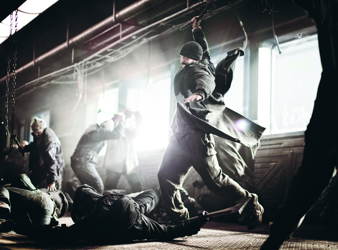 Babies schmecken am besten“, erinnert sich der traumatisierte Revolutionsführer Curtis (Chris Evans) an den Horror vor 17 Jahren, als die Hungersnot unter den in fensterlosen Waggons eingepferchten Menschen so extrem war, dass es zu Kannibalismus kam. Inzwischen ist für ausreichende Ernährung gesorgt, aber noch immer vegetieren die Armen in der dritten Zugklasse unterdrückt in elenden Verhältnissen, während die Reichen in der ersten Klasse luxuriös in Saus und Braus leben. Der „Snowpiercer“ ist ein 650 Meter langer Zug, der nonstop unterwegs rund um die Erde ist, die er jedes Jahr einmal umkreist. Bei den Fahrgästen handelt es sich um die letzten Überlebenden der Menschheit, nachdem eine Klimakatastrophe die Erde in eine Eiswüste verwandelt hat. Abgeschottet im Maschinenraum an der Spitze der futuristischen Eisenbahn residiert Wilford (Ed Harris), der von den Reichen vergötterte geniale Konstrukteur des Perpetuum Mobiles auf Schienen. Curtis ist entschlossen, die Herrschaft des Machiavellisten zu brechen, um den spirituellen Leiter der Armen, Gilliam (John Hurt), zum Zugführer zu machen. An der Spitze seiner Mitstreiter kämpft sich Curtis im erbitterten Gefecht mit Wilfords bewaffneten Schutztruppen vom Ende des Zuges Waggon für Waggon nach vorne durch bis zur Lok.