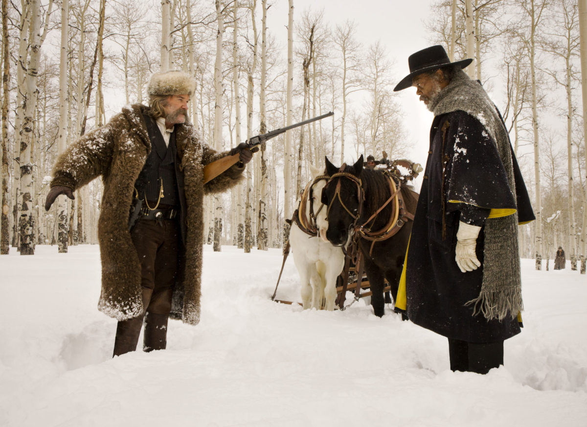 Tarantino ließ sich diesmal nach eigener Aussage von den zahlreichen, vor allem in den fünfziger und sechziger Jahren populären Westernserien inspirieren, doch natürlich gibt es wie stets in den Werken des lebenden Filmlexikons auch Anspielungen auf Kinofilme quer durch die Genres. Neben Tarantinos eigenem Kammerspiel Reservoir Dogs (1992) stand diesmal etwa John Carpenters The Thing aus dem Jahr 1982 Pate (Kurt Russell spielte dort einen jener Männer, die in einer arktischen Forschungsstation nach und nach von einem Alien dezimiert werden, Ennio Morricone komponierte). Ein anderes Genre, das Tarantino hier aufgreift, ist das des Whodunit, also des Kriminalkammerspiels: eine überschaubare Anzahl an Verdächtigen in einem begrenzten Setting. Und auch die von Hitchcock geprägten Begriffe „surpise“ und „suspense“ bedient Tarantino gleichermaßen.