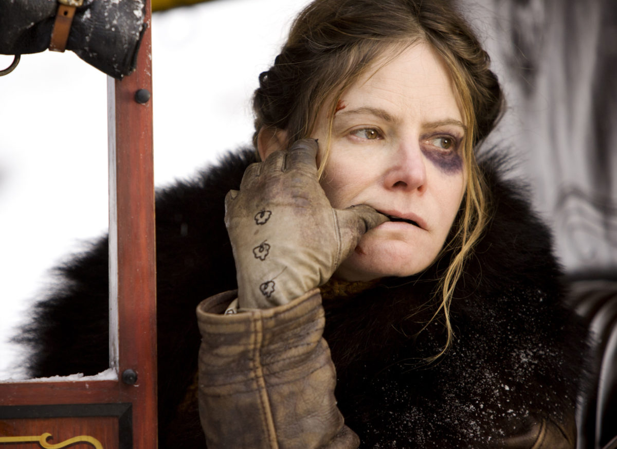 Doch Tarantino, der bereits in seinen letzten Arbeiten Inglourious Basterds (2009) und Django Unchained (2012) das Thema Rache mit alternativen Geschichtsentwürfen koppelte, zielt auch hier auf mehr ab als bloße Genrespielereien: Dass die komplexeste Figur die des Major Warren ist (von Samuel L. Jackson mit gewohnt charismatischer Badassery gespielt), ist kein Zufall, denn Rassismus ist ein Leitthema des Films, der somit gewissermaßen an Django Unchained anschließt. Warren musste sich seit jeher in einem Land behaupten, das ihm aufgrund seiner Hautfarbe mit Verachtung begegnet. Was ihm einigermaßen half, waren Briefe, die ihm angeblich Abraham Lincoln persönlich schrieb, sowie seine Leistungen im Sezessionskrieg. So hat Warren eine Vielzahl Südstaatenoffiziere getötet – allerdings kamen bei einem Brandanschlag Warrens auf ein Südstaatenlager auch zahlreiche Offiziere aus dem Norden ums Leben (wirklich betrübt scheint ihn dieser Kollateralschaden nicht zu haben). Darüber hinaus hat Warren auch Indianer auf dem Gewissen. Warren ist somit der klassische Antiheld, doch hundertprozentig gut erscheint hier, abgesehen vielleicht vom Kutscher, auch sonst niemand. Das N-Wort führen so gut wie alle im Mund und Daisy Domergue als einzige Frau bezieht mehr als einmal Prügel.