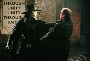 Mit den berühmten Zeilen aus dem volkstümlichen Gedicht beginnt auch der Film, eine recht ungewöhnliche und erfrischende Variante von Comics-Verfilmung. Zeit und Ort: England in einer nicht allzufernen Zukunft. Ein faschistisches Regime unter dem „High Chancellor“ Adam Sutler (brillant: John Hurt) unterdrückt Land und Leute. Als die junge Evey Hammond (Natalie Portman) am Abend des 5. November die nächtliche Ausgangssperre missachtet, wird sie von zwei brutalen Schergen aufgegriffen und (auch sexuell) bedroht. Da kommt ihr ein Mann (Hugo Weaving) zu Hilfe, dessen Kleidung und Maske an den historischen Guy Fawkes erinnern, mit einem tief eingekerbten V (für Vendetta = Rache) im Gesicht. Eveys Versuche, ihrem Retter zu danken, gehen ins Leere, denn der Maskenmann hat noch etwas vor an diesem Abend: Er lässt den Turm des berühmten Londoner Gerichtshofs Old Bailey in die Luft fliegen. Das Regime wankt zwar kurz, aber es fällt noch lange nicht: Sutler und seine üblen Spießgesellen (seine rechte Hand Creedy, mit eisiger Kälte dargestellt von Tim Pigott-Smith, die gleichgeschalteten Medien und die Polizei) lügen den Anschlag postwendend um: Der Old Bailey solle durch ein modernes Gerichtsgebäude ersetzt werden, die Sprengung sei also amtlicherseits erfolgt.