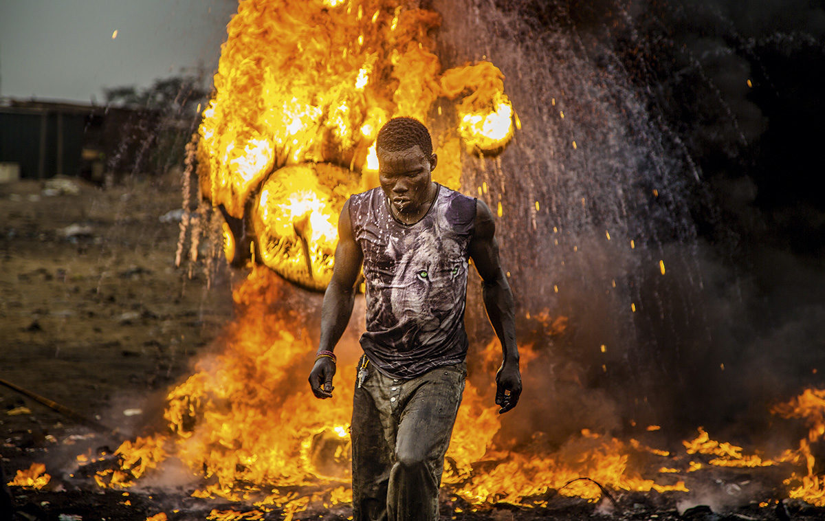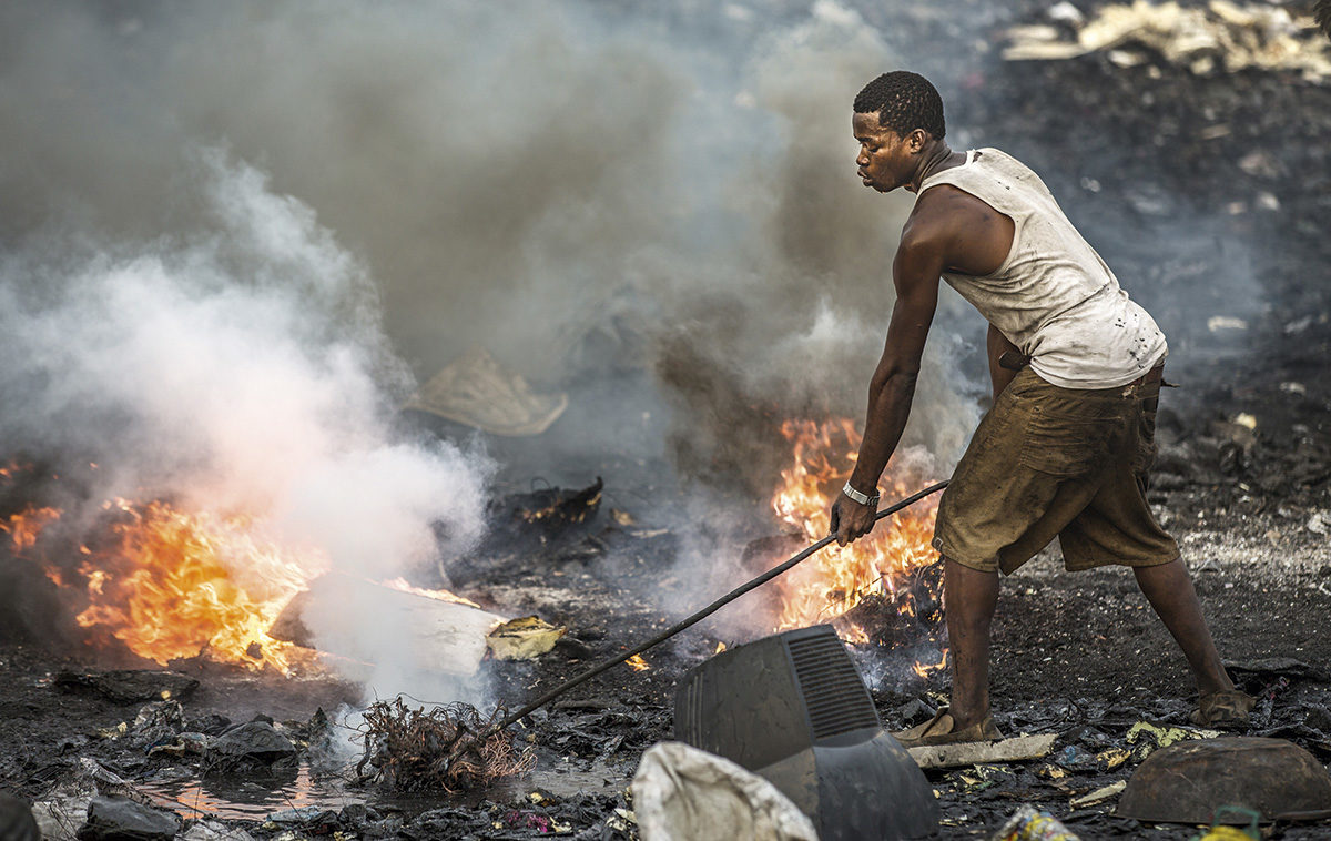 Die österreichischen Dokumentaristen Florian Weigensamer und Christian Krönes filmen in Agbogbloshie am Rande von Accra, Ghana, wo jährlich 250.000 Tonnen illegal aus Europa ausgeführten Elektroschrotts, tja, nicht wirklich recycelt, aber in Einzelteile zerlegt oder zu Klump geschlagen werden, vieles geht auch in Flammen auf. Die Kabelbrenner stehen in der mafiös organisierten Hierarchie ganz oben; Frauen sind, wie immer, für die Versorgung zuständig. Dazwischen Ziegen und Rinder, die auch immer noch irgendwo irgendetwas Brauchbares aus den Müllbergen ziehen. Sowie kleine Kinder, die den in schwarzen Schwaden stehenden Männern das kühlende Wasser verkaufen.