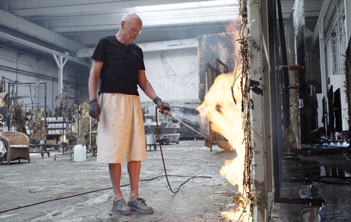 Wim Wenders: Wie darin Geschichte verarbeitet wird, auch deutsche Geschichte, und Mythen, der Urgrund aller Geschichten. Seine Kunst spricht mich an, weil in ihr eine große Schönheit liegt, auch wenn die Bilder von ihm zum Teil malträtiert werden, wie er sie z. B. draußen im Freien stehen lässt, manche jahrelang, und alles tut, um sie einem Prozess der Zersetzung zu unterziehen. Anselm arbeitet mit den verschiedensten Techniken, sei es mit Feuer oder Blei oder mit Elektrolyse. Einige Bilder lässt er im Ofen „backen“, bis sie aussehen, als ob sie jahrelang unter der Wüstensonne gelegen hätten. Seine Werke sind im wahrsten Sinne des Wortes „Zeit-Zeugen“, mehr als irgendeine andere Kunst, die ich kenne. Und diesen Zugang, wie er die Zeit in die Malerei eingebracht hat, den finde ich atemberaubend.
