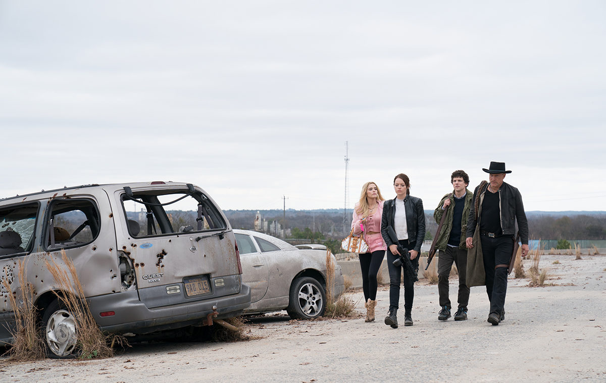 An der Ausgangssituation hat sich nicht viel verändert: Columbus und Wichita (immer noch ein Paar) sowie Tallahassee und Little Rock streifen immer noch durch ein postapokalypisches, zombieverseuchtes Amerika. Die Suche nach Überlebenden haben sie mehr oder weniger aufgegeben. Sie sind im desolaten Weißen Haus einquartiert, was den Drehbuchautoren reichlich Gelegenheit bietet, ihren Witz zu beweisen. Und doch, zwei Sachen sind anders: Das Budget des Films ist ganz offensichtlich höher (doppelt so hoch, wie um dem Titel gerecht zu werden), und die Zombies haben mächtig aufgerüstet und sind wesentlich widerstandsfähiger geworden, weshalb die robustesten von ihnen von den wackeren Zombiejägerinnen und -jägern inzwischen „T-800“ genannt werden. Die Referenz an Terminator ist nicht der einzige Bezug zur Populärkultur, auch Walking Dead (und vieles andere) kommt spaßig vor. Schließlich kommen die Dinge in Bewegung, als Tallahassee und Columbus in einer Shopping Mall doch noch eine sehr blonde Überlebende (großartig: Zoey Deutch) entdeckt haben und nachdem Wichita und Little Rock beschlossen haben, ihre Männer zu verlassen. Man trifft sich aber bald wieder, eh klar, diesmal im völlig heruntergerockten Graceland bzw. in der Hound Dog Bar nebenan, die von der wunderbaren Rosario Dawson betrieben wird. Der Elvis-Mythos samt Blue Suede Shoes bietet ausreichend Stoff für weitere hübsche Drehbucheinfälle.